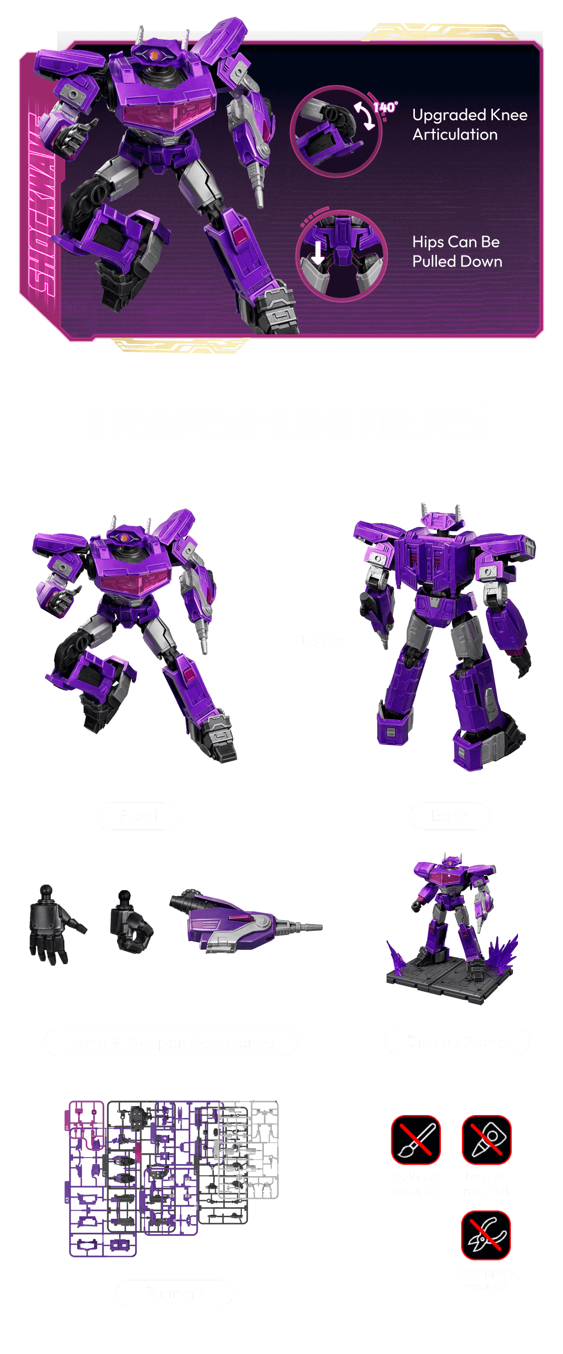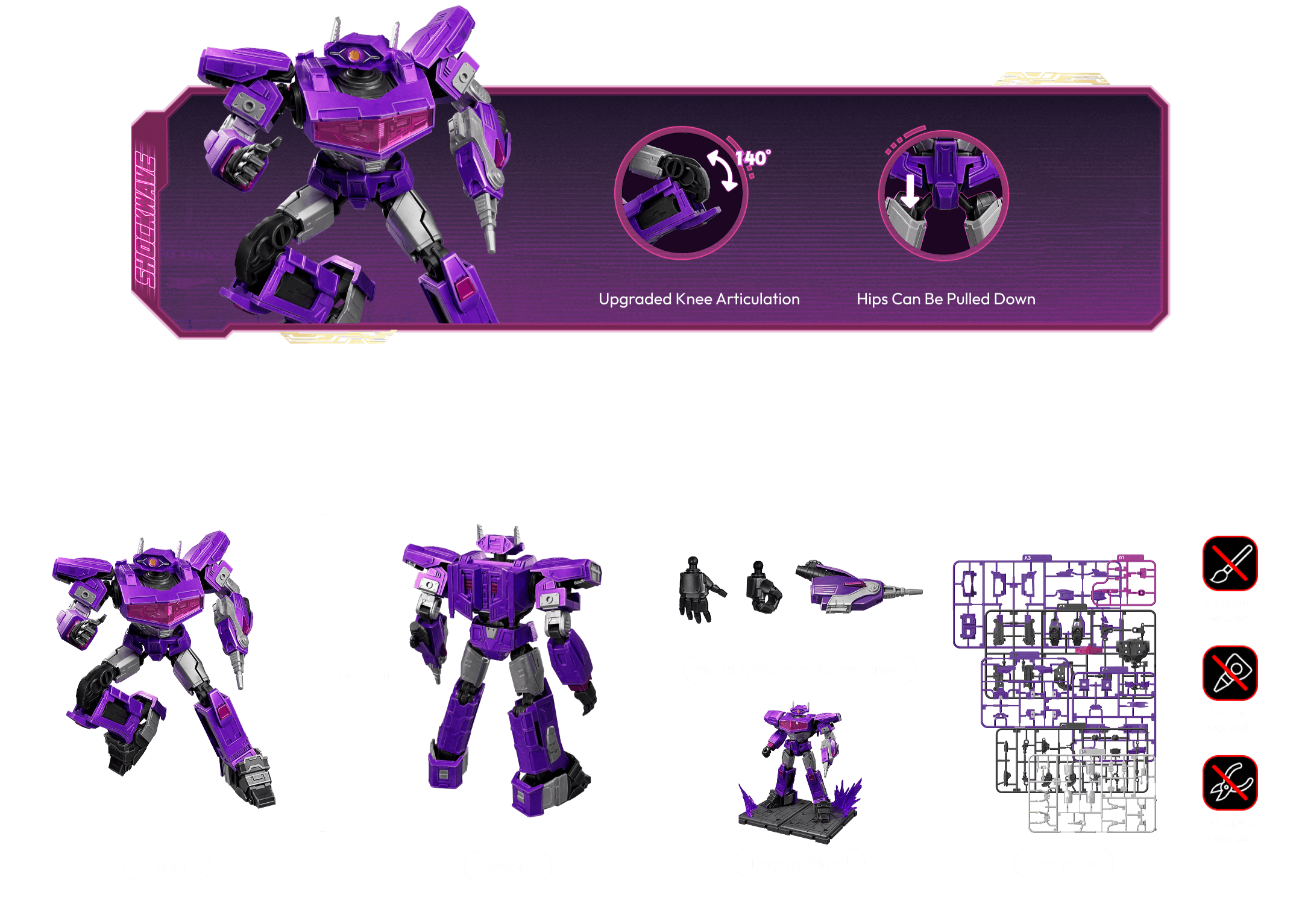 Once assembled, Shockwave stands approximately 12.5 cm tall (about 4.9 inches) and features 20 articulation points. Enhanced knee and hip joints allow for dynamic poses that capture his calculated, battle-ready stance.