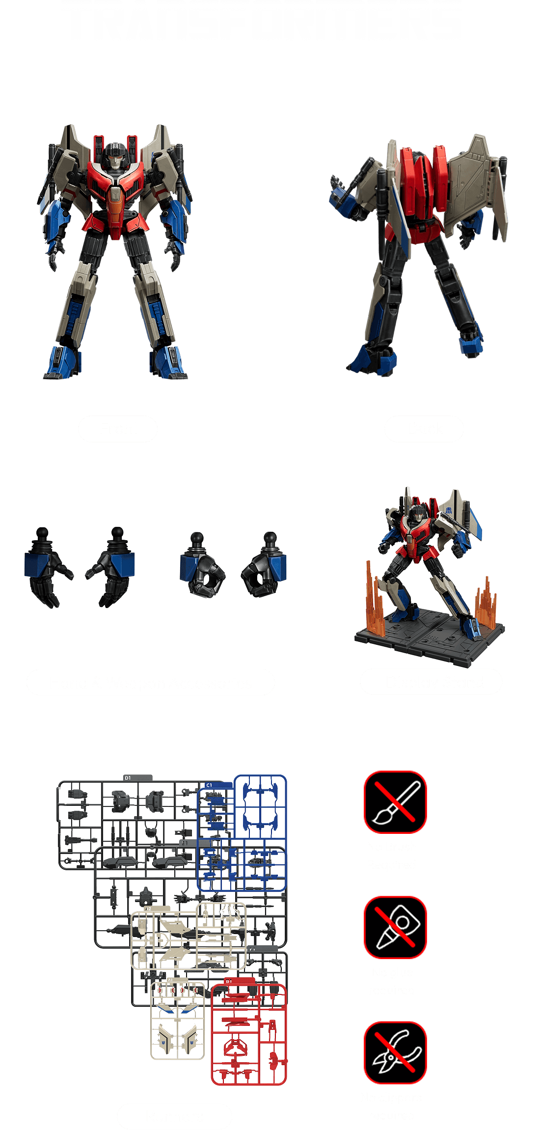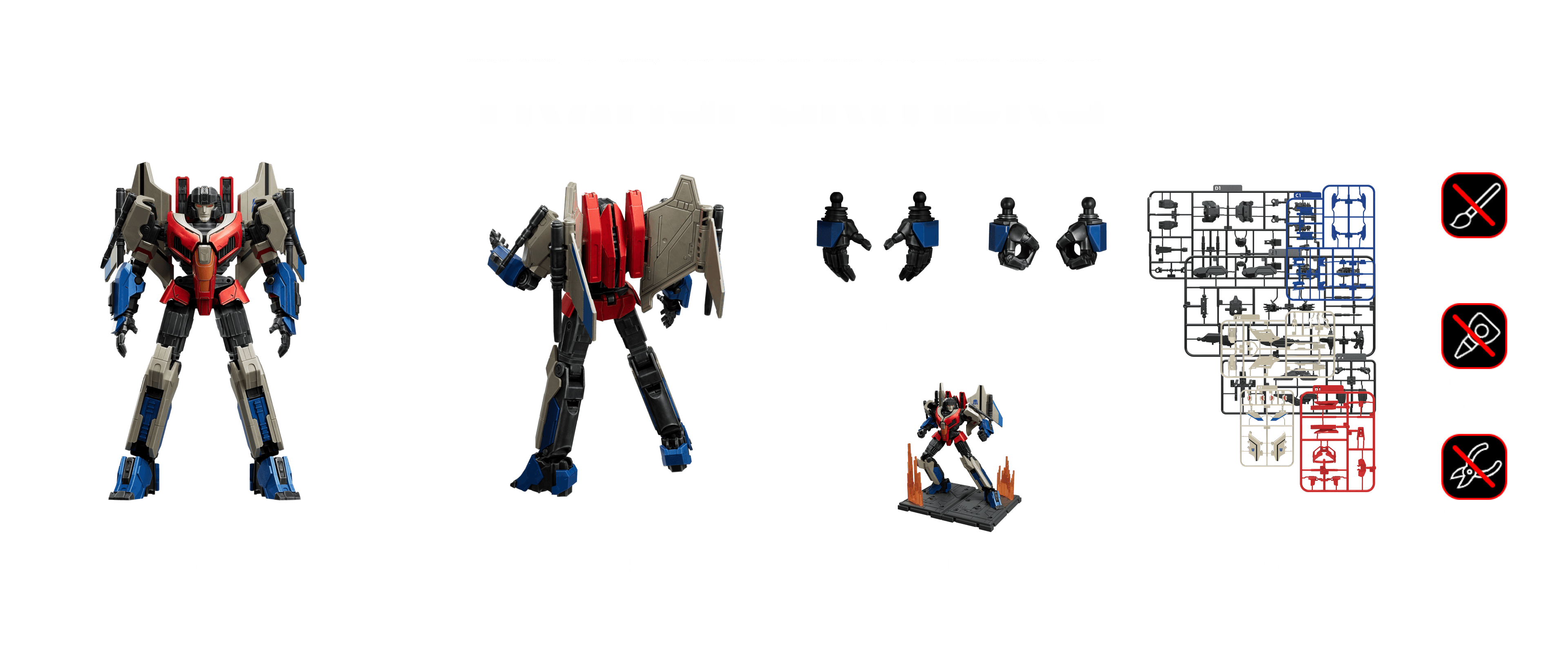The 12.6cm Starscream model kit brings the Champion Series character to life with screen-accurate details. Every panel and battle scar from Transformers ONE is meticulously recreated.