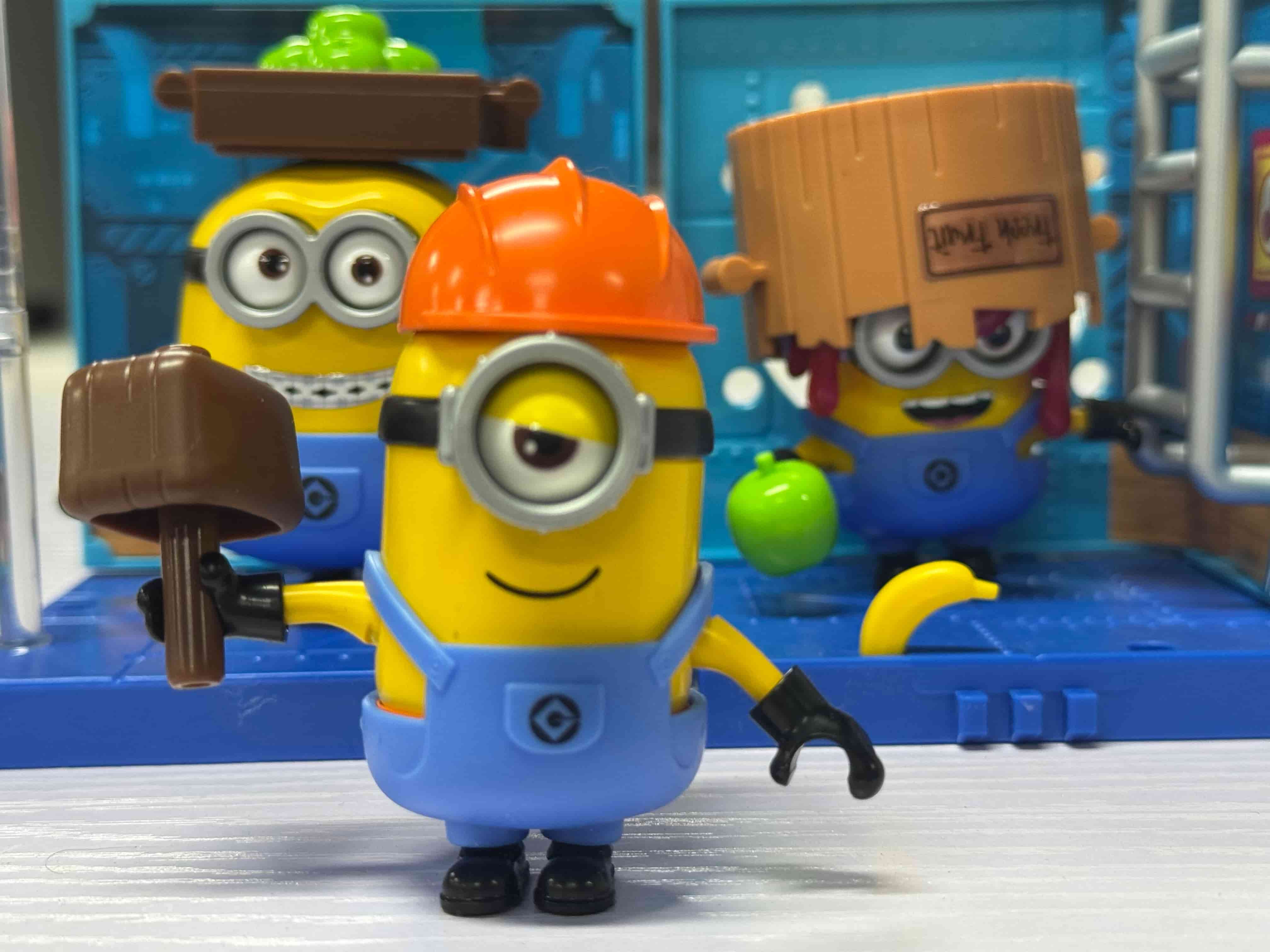 Each Minion includes exclusive themed props like fruit pieces, safety helmets, tools, and jelly containers that enhance storytelling and imaginative play scenarios.