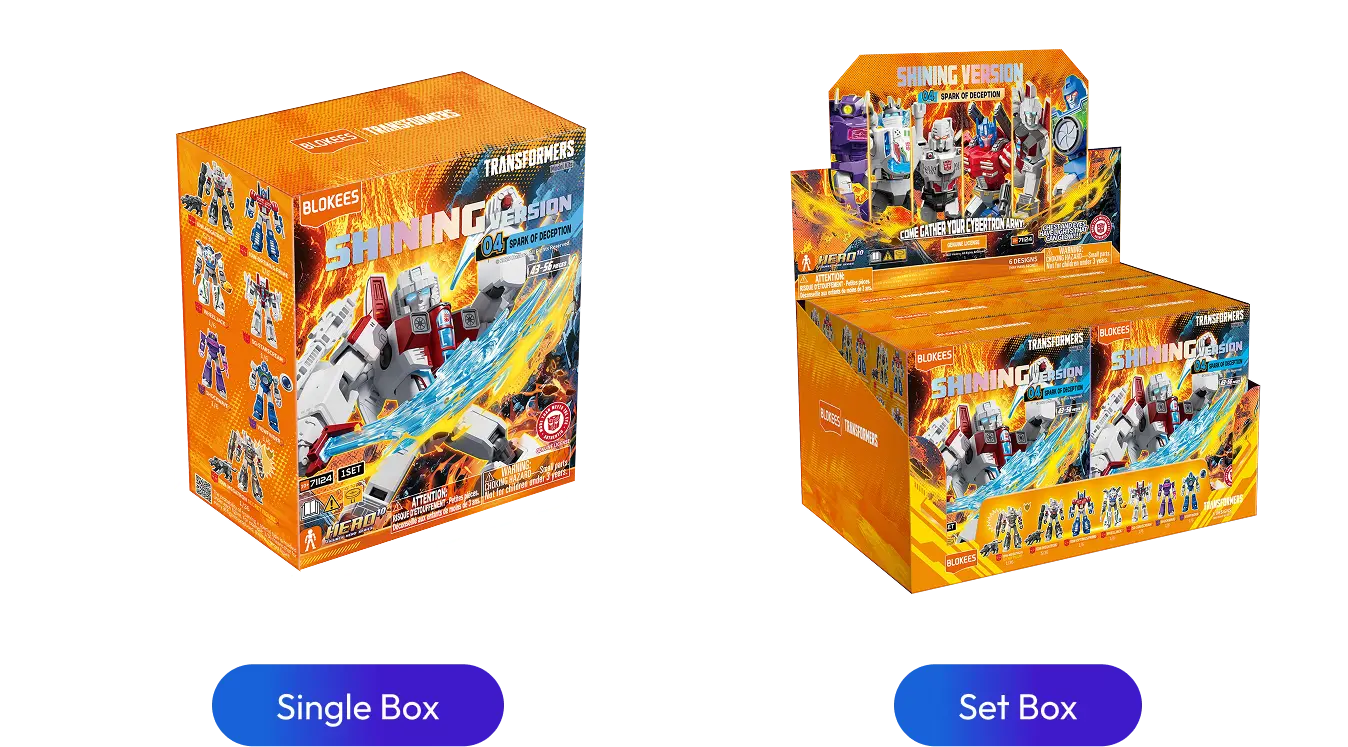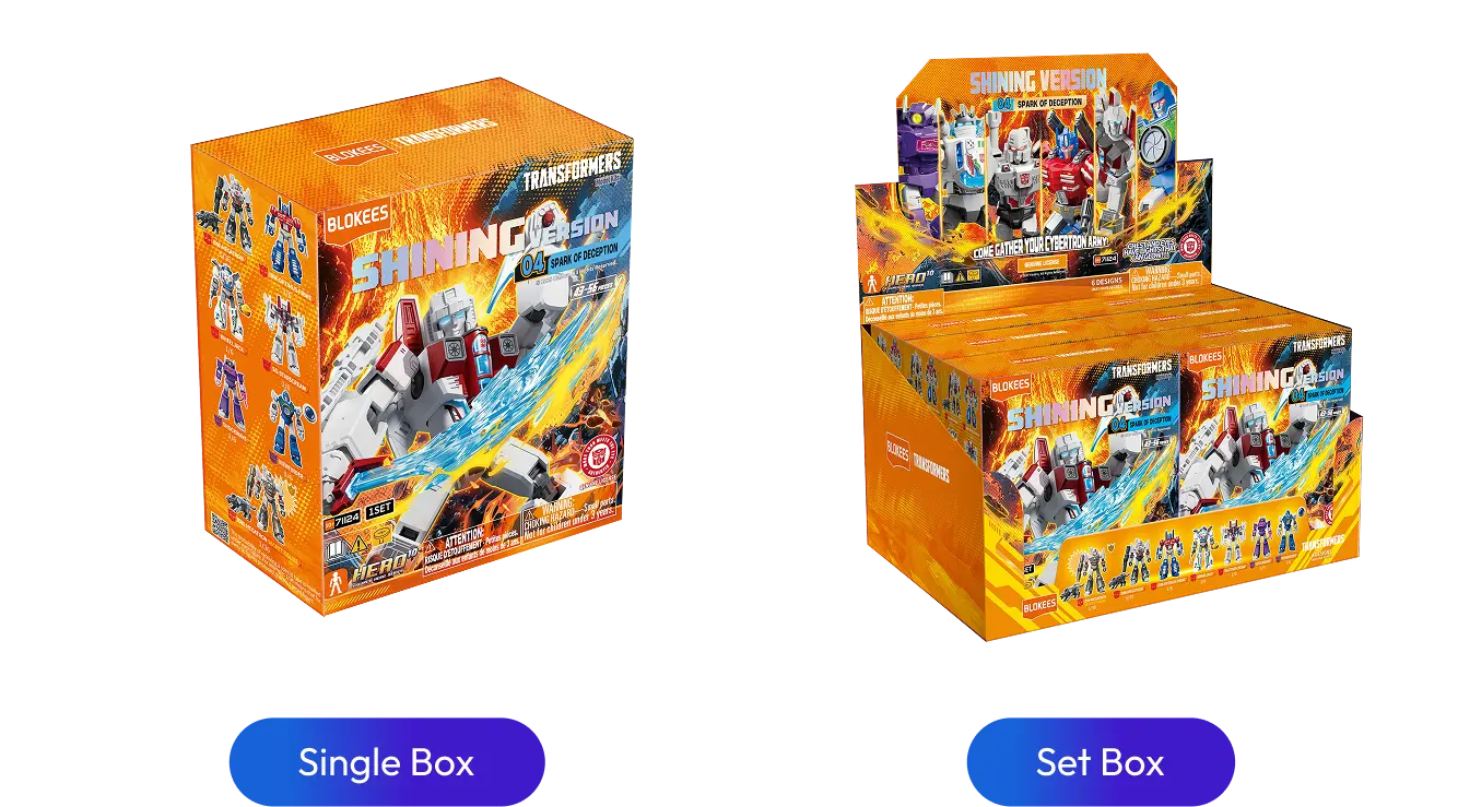 Set Box: Surprisebox format with 6 characters, including Special Edition IDW-Megatron (1/36 chance)