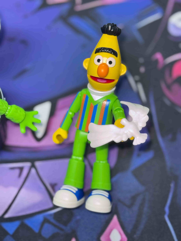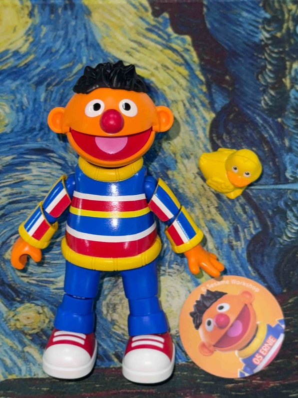 Ernie brings joy everywhere with his orange face, striped sweater, and carefree attitude. His love for simple pleasures - especially his squeaky yellow bath companion - reminds us all to find happiness in the little things!