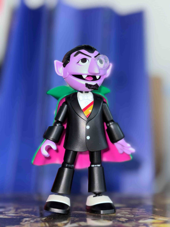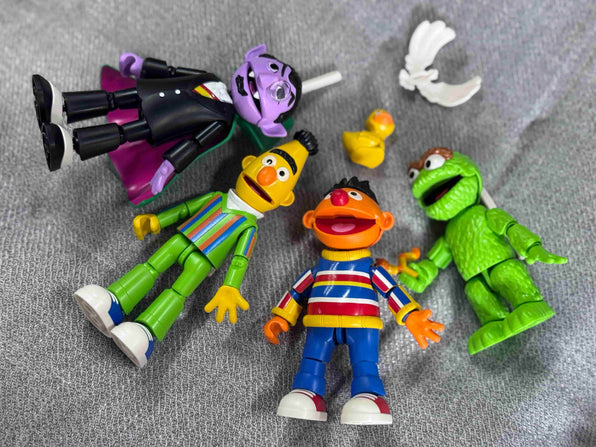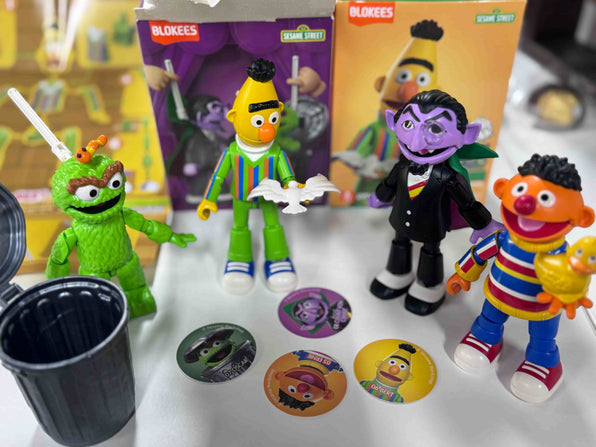 Everyone comes with their signature pals - Ernie has his rubber duckie, Bert brings his pigeon, Oscar includes his trash can and Slimey, and Count has his special cape.