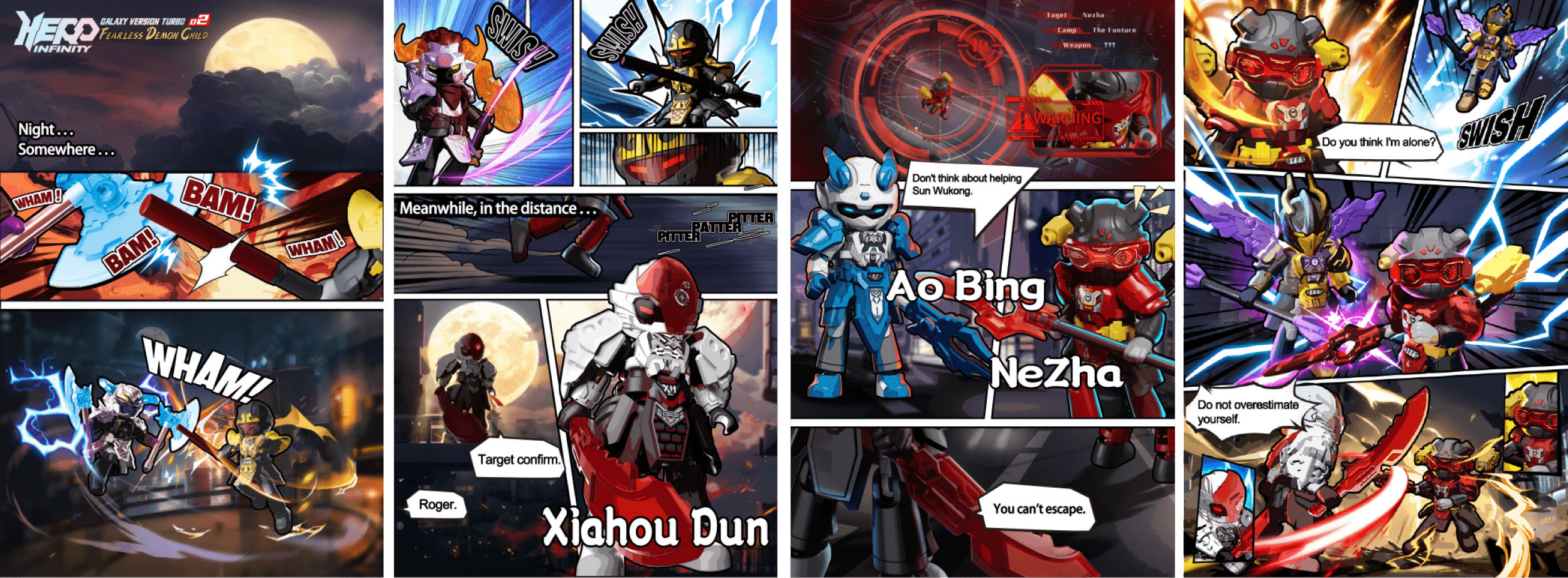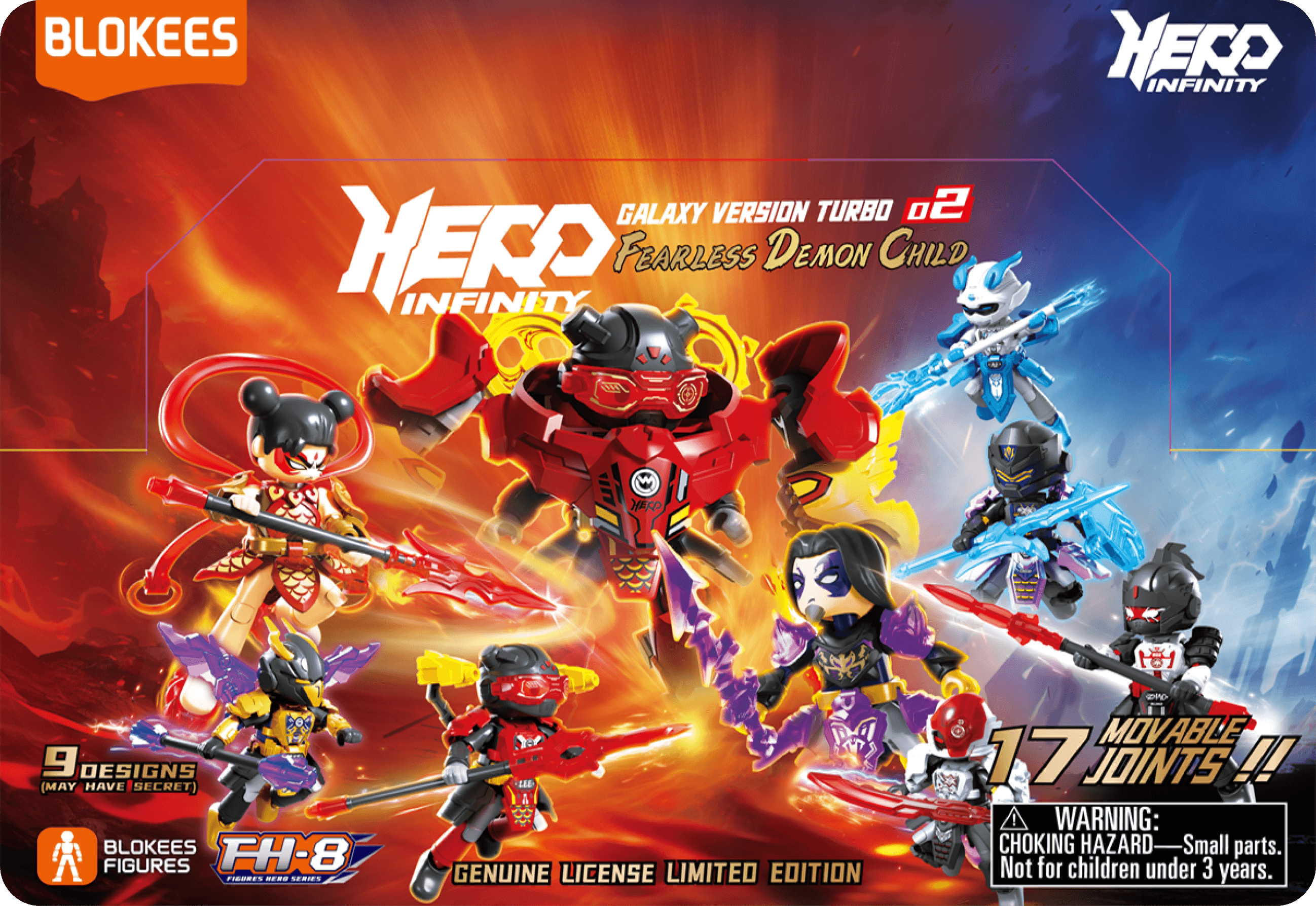 This series includes nine iconic characters from the Hero Infinity universe, each crafted with unique gear and abilities. Collectors can also find three rare variants: Silver Hidden Ao Bing (Deep-Sea Armor), Golden Hidden NeZha (Fired-Steel Armor), and the ultra-rare Galaxy Hidden Lotus Exoskeleton, each with unique finishes and exclusive weapons.