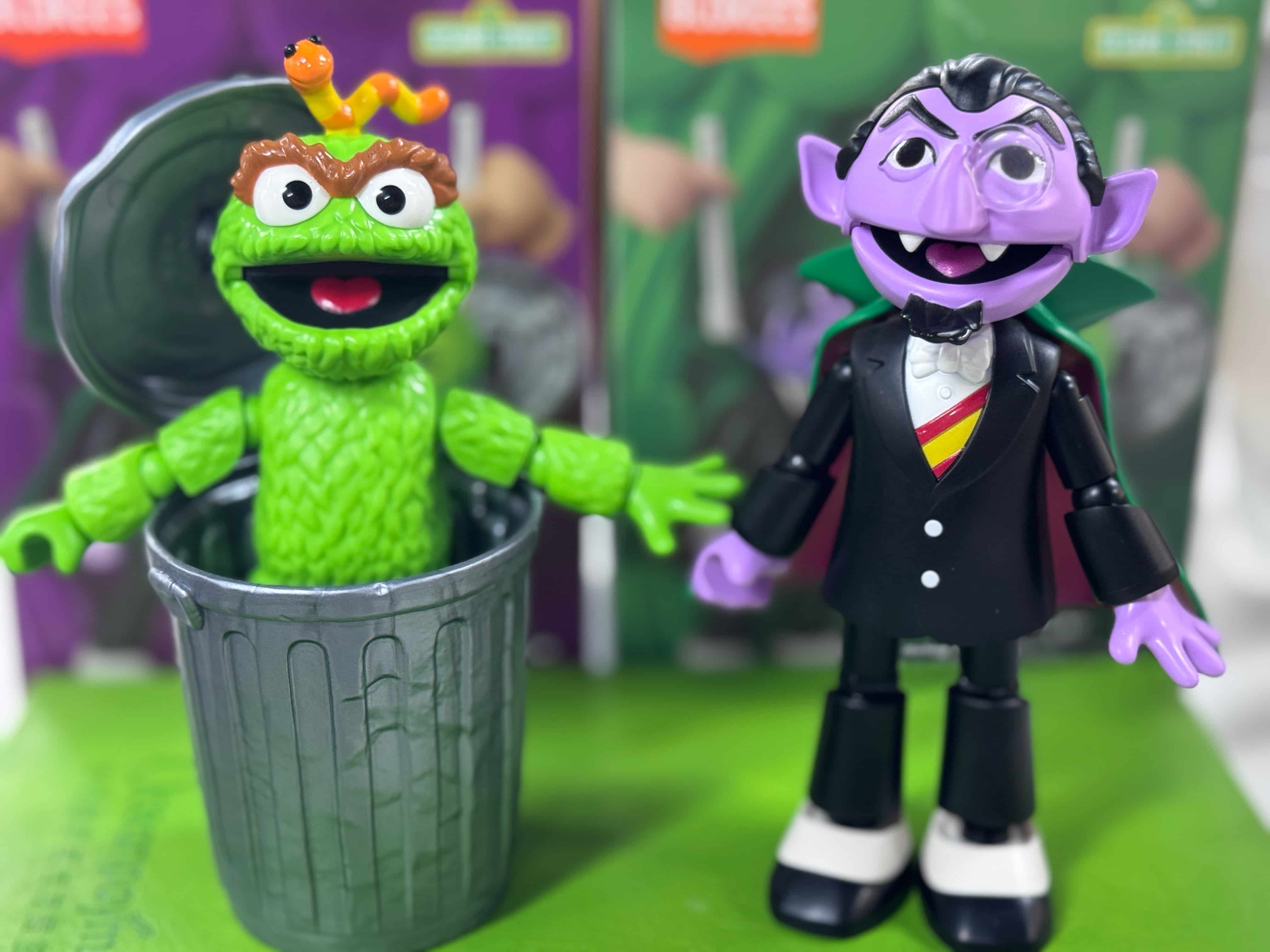 Everyone comes with their signature pals - Ernie has his rubber duckie, Bert brings his pigeon, Oscar includes his trash can and Slimey, and Count has his special cape.