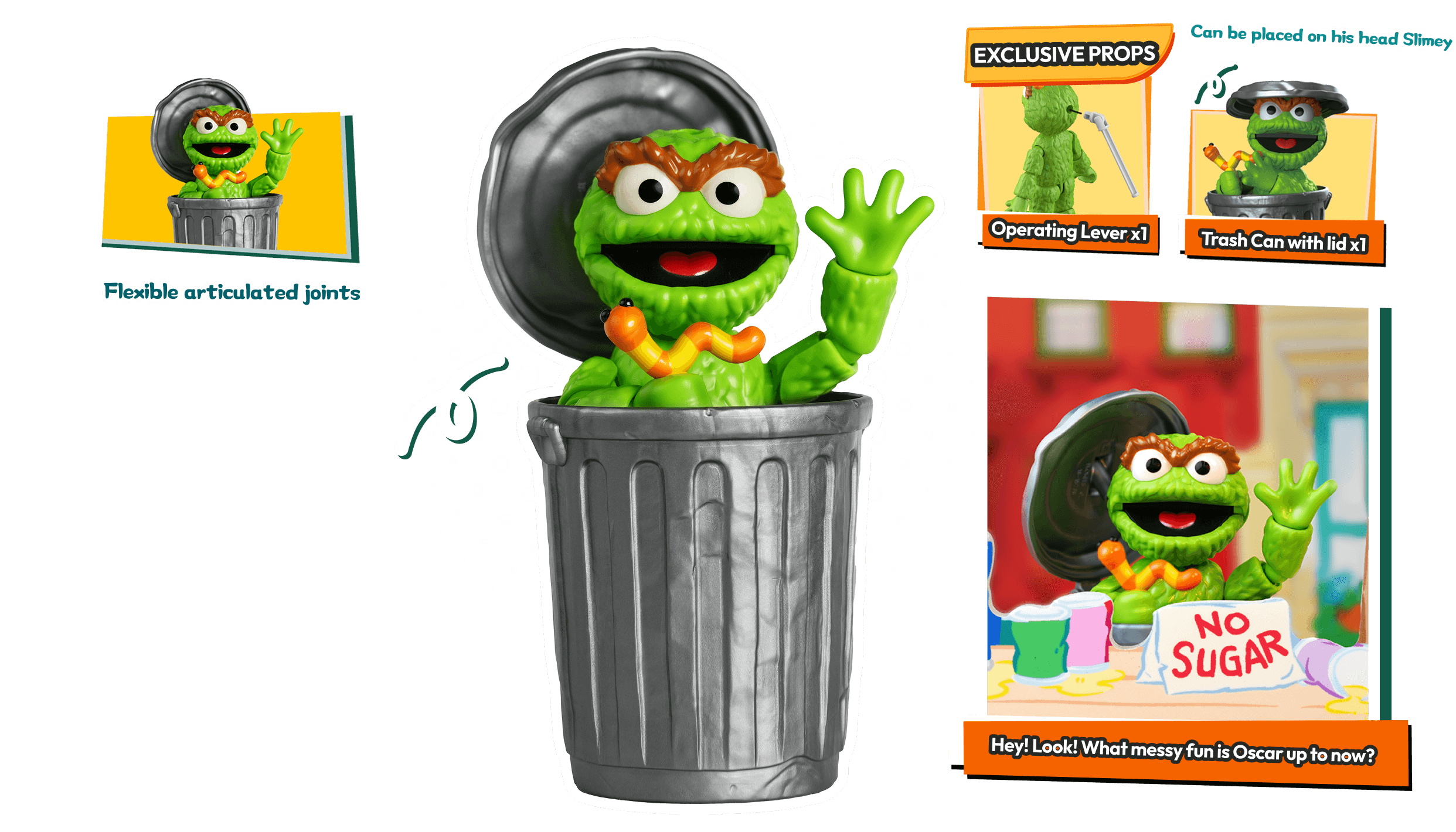 My son is obsessed with Oscar. He loves the trash can, he loves Slimey, and he loves making Oscar grumble with the mouth lever. He's a wonderfully grumpy little guy.