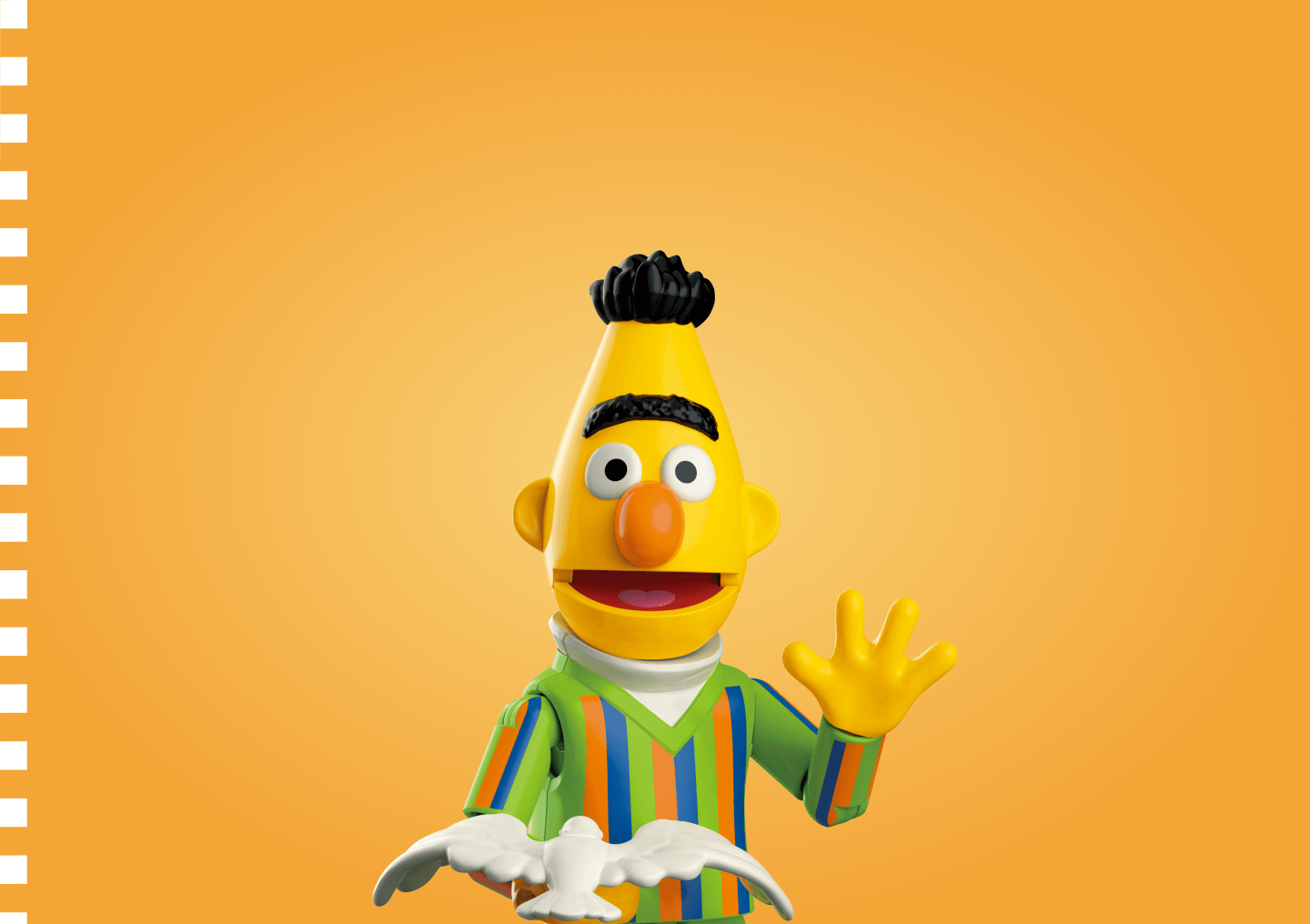 Ernie brings joy everywhere with his orange face, striped sweater, and carefree attitude. His love for simple pleasures - especially his squeaky yellow bath companion - reminds us all to find happiness in the little things!
