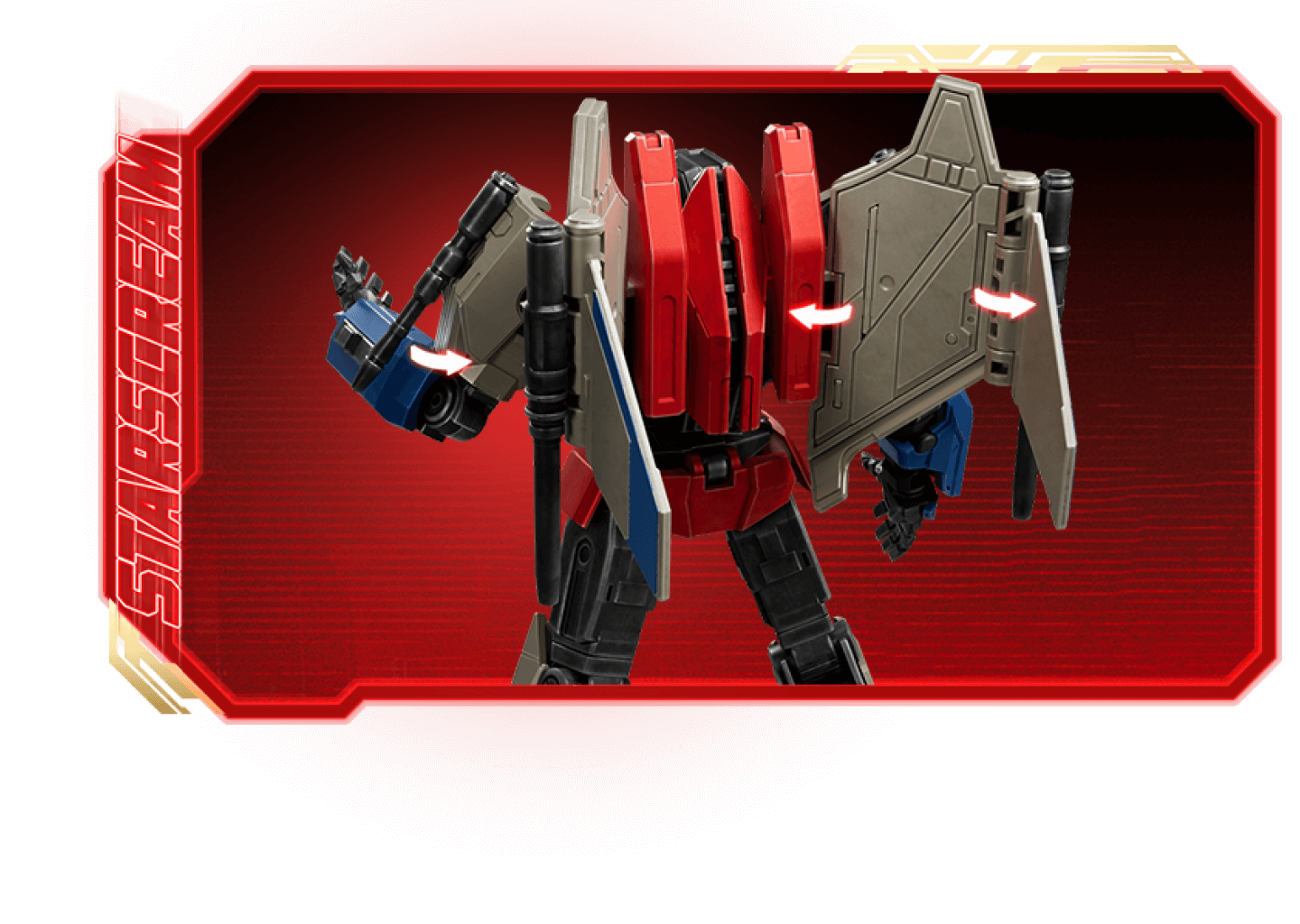 Built-in LED modules power up Starscream's eyes and chest with dramatic lighting effects, making this Decepticon leader truly come alive on display.