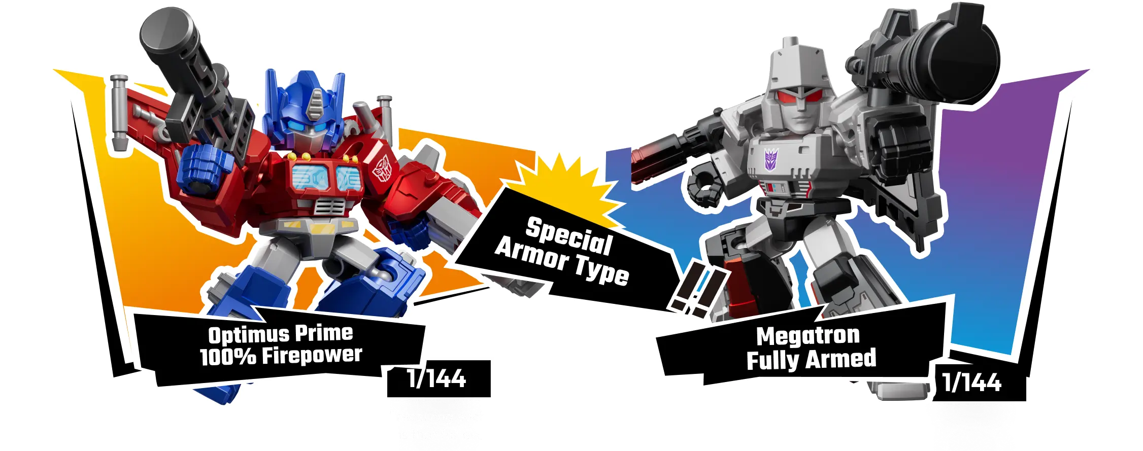 Every box in your 12-pack set is a treasure waiting to be discovered, with special armor types hidden inside.  You'll find amazing robots and vehicles, plus bonus collector items like commemorative coins and special cards. The best part? You're guaranteed to find chase model kits, including the super-rare Optimus Prime Firepower and Megatron Fully Armed editions!