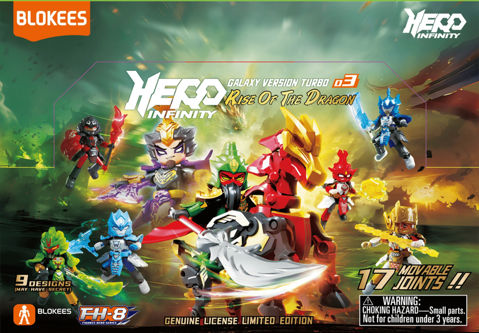 This series includes nine iconic characters from the Hero Infinity universe, each crafted with unique gear and abilities. Collectors can also find three rare variants: Silver Hidden Ao Bing (Deep-Sea Armor), Golden Hidden NeZha (Fired-Steel Armor), and the ultra-rare Galaxy Hidden Lotus Exoskeleton, each with unique finishes and exclusive weapons.