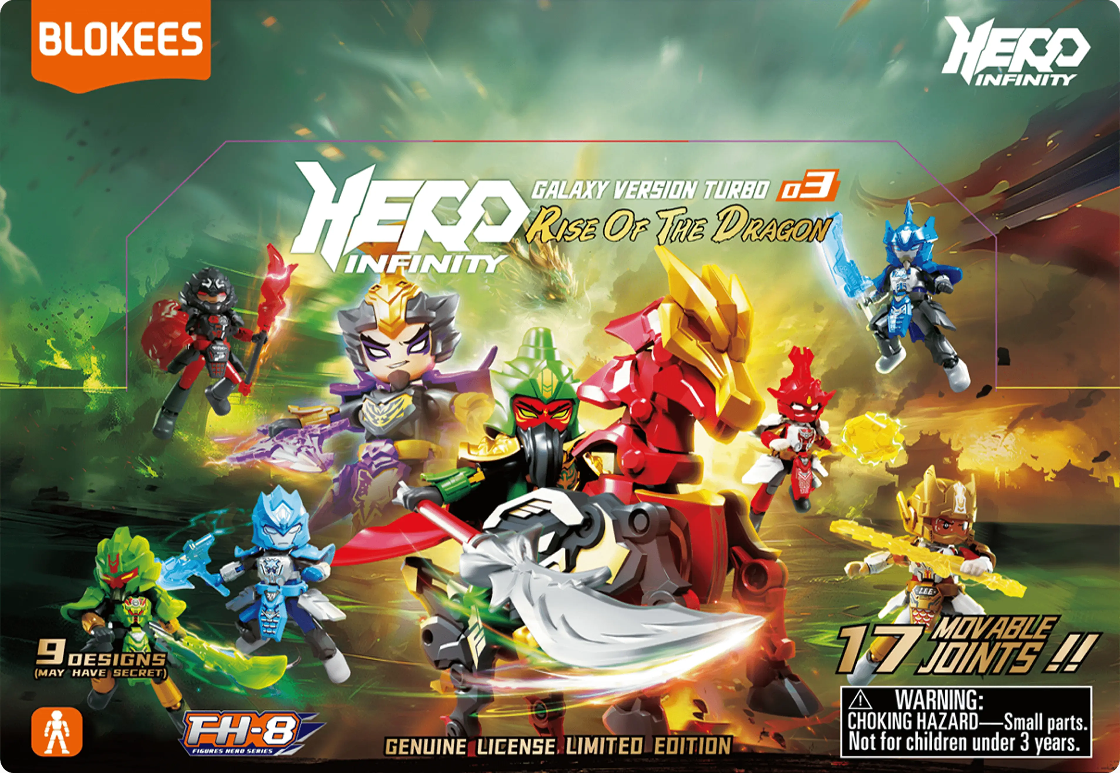 Hero Infinity Galaxy Version Turbo 03 | Rise of the Dragon is a series of collectible surprise box model kits featuring characters inspired by the Three Kingdoms and Investiture of the Gods, reimagined with a futuristic, sci-fi aesthetic. These model kits are highly detailed, posable, and come with interchangeable armor and weapons. They also include a card battle game element for added playability and collectibility.