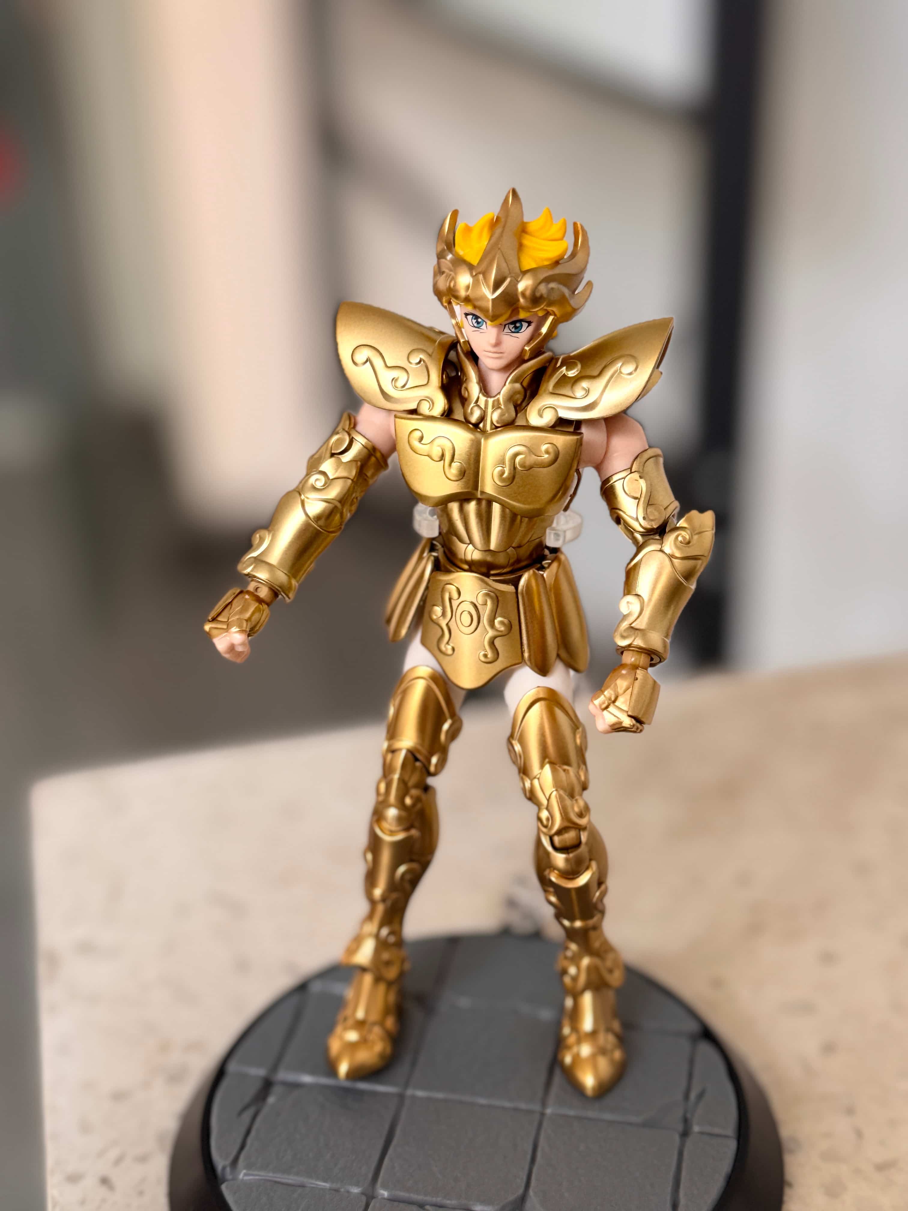 ¡Guau, guau! El acabado dorado prepintado de esta Aiolia es impresionante. Parece mucho más cara de lo que era. Los 44 puntos de articulación te permiten crear poses realmente dinámicas para exhibir. El soporte incluido funciona de maravilla, incluso con la pieza de efectos. Encaja a la perfección. ¡Un beso del chef! 👌