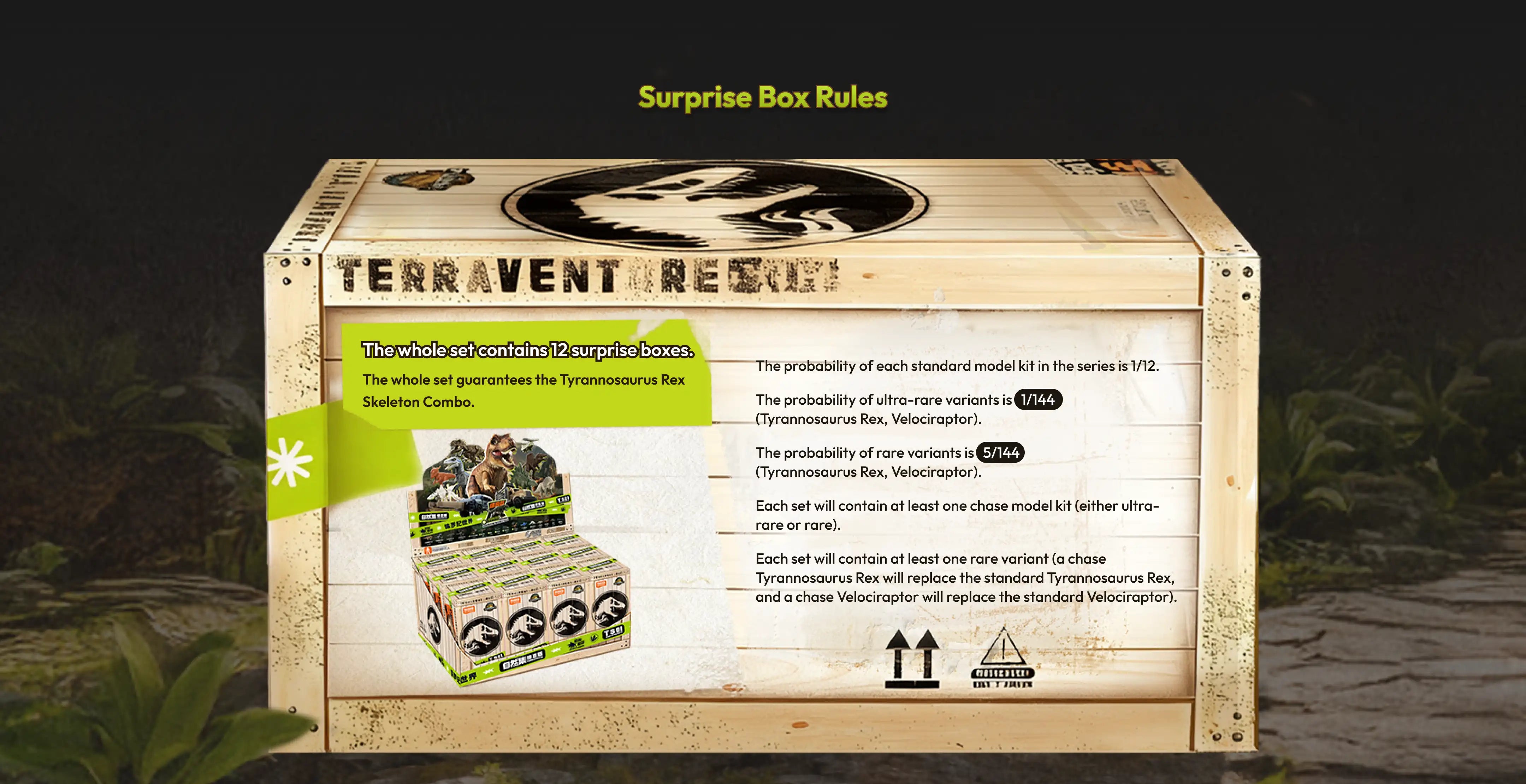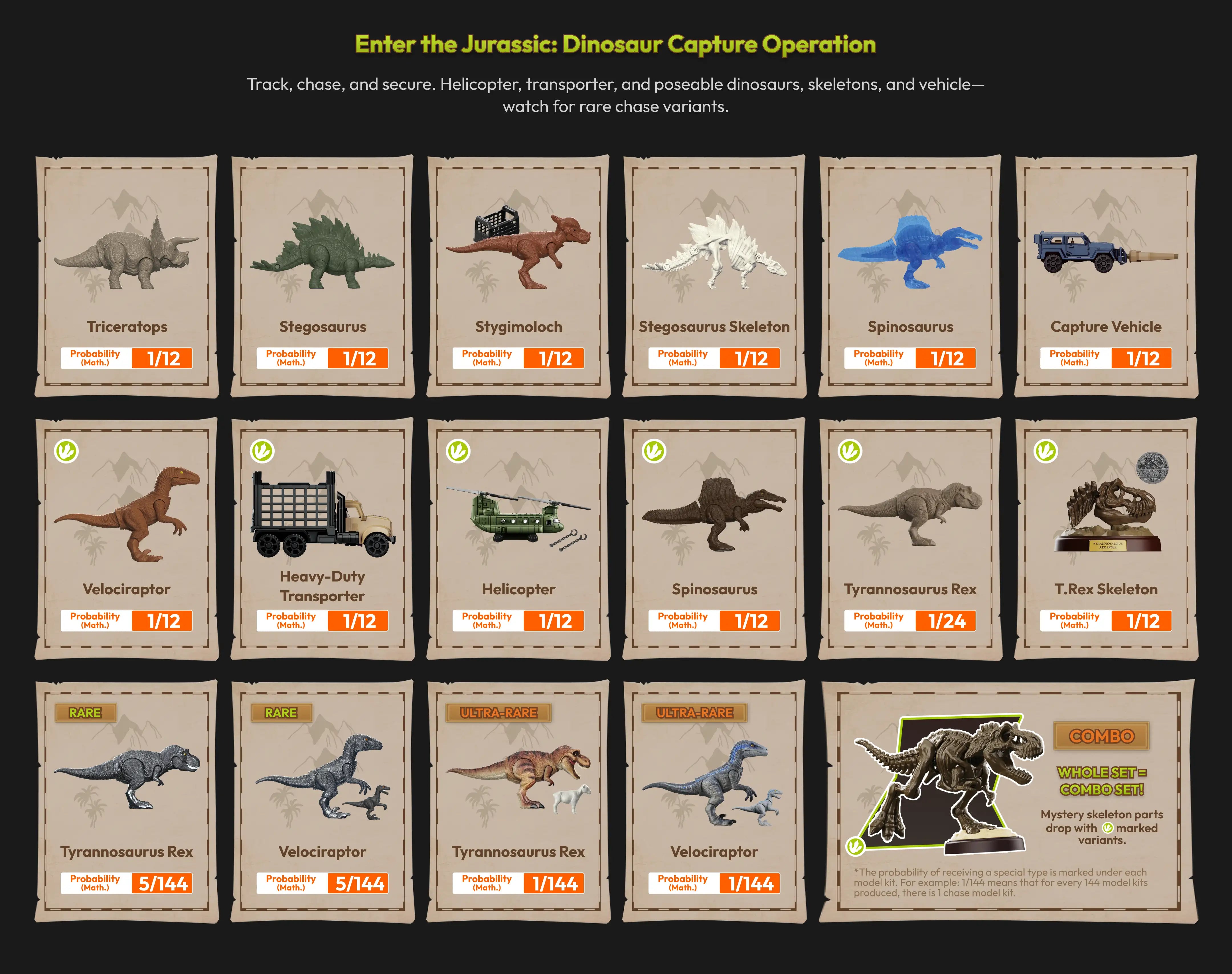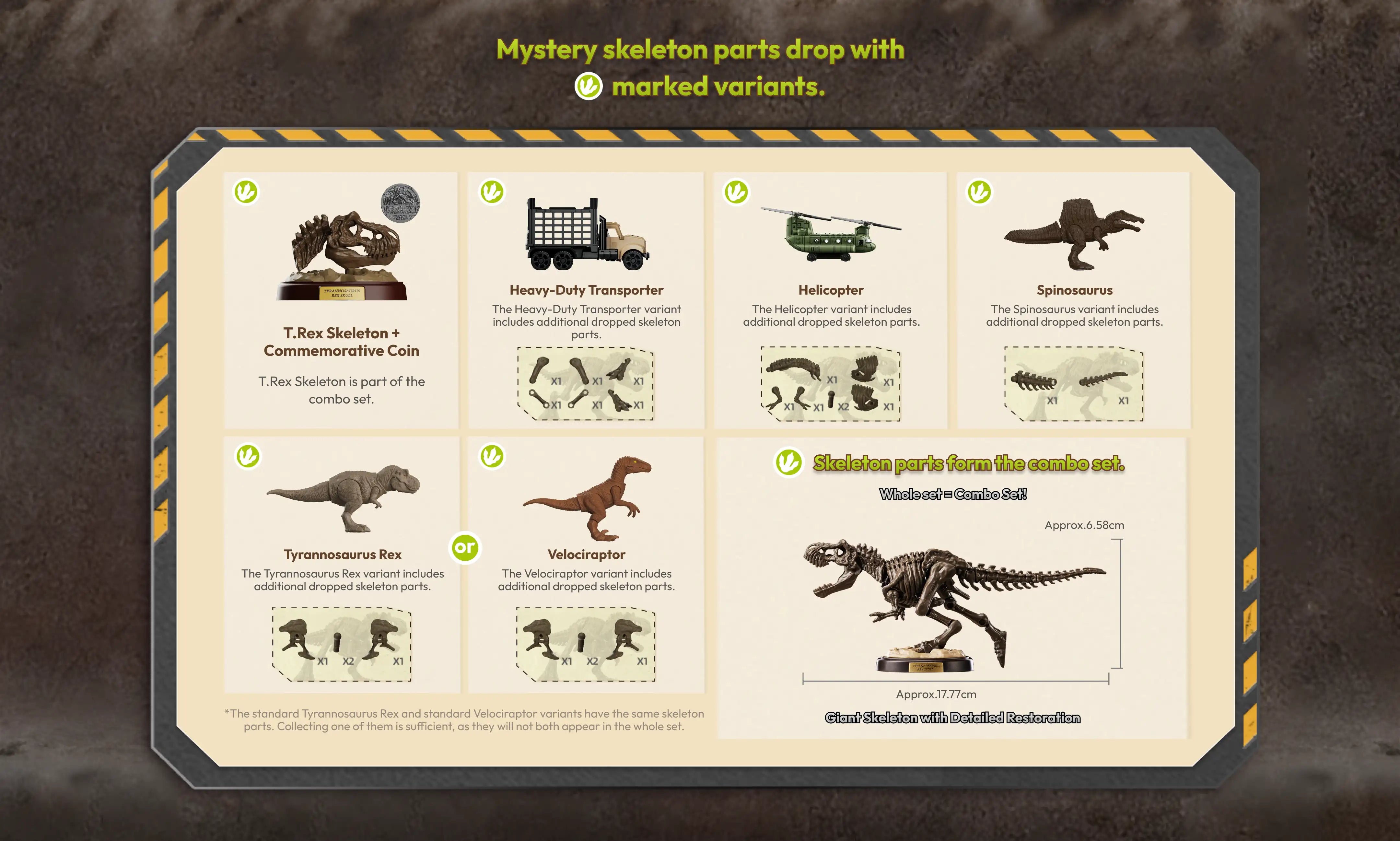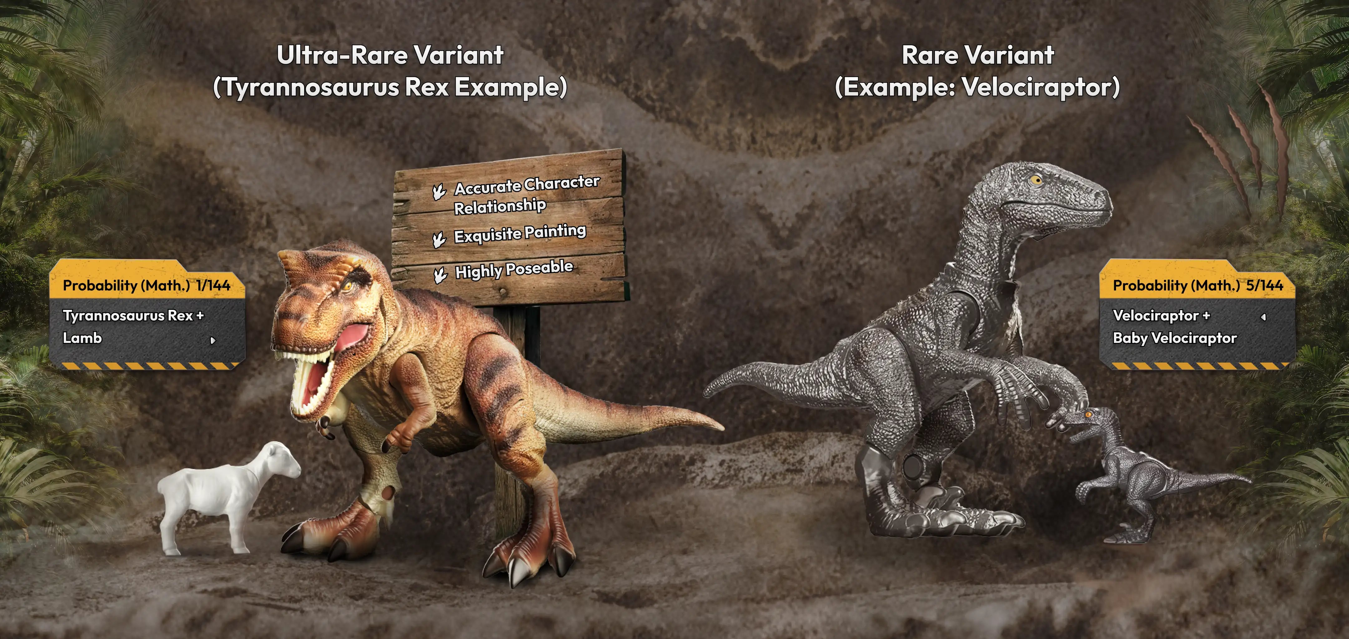 Chase Rare Variants (Odds: 5/144) and Ultra-Rare Variants (Odds: 1/144). When you purchase the whole set, you are guaranteed to receive a rare variant, along with the exclusive Tyrannosaurus Rex skeleton Combo.