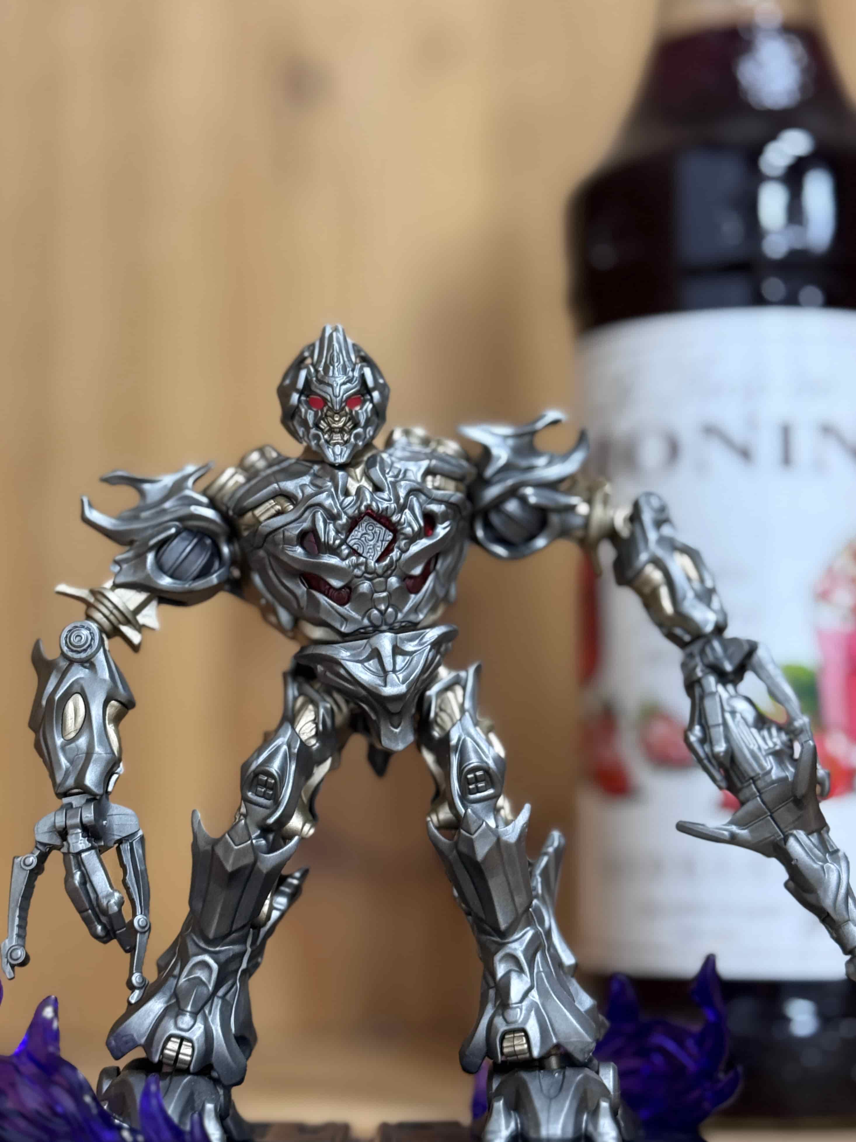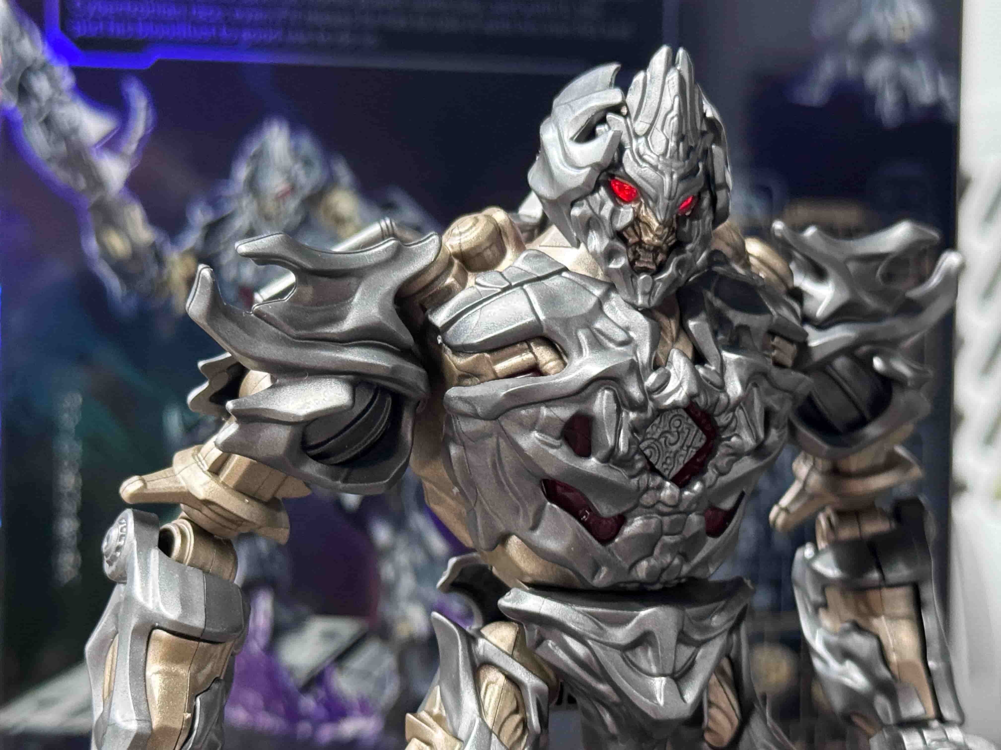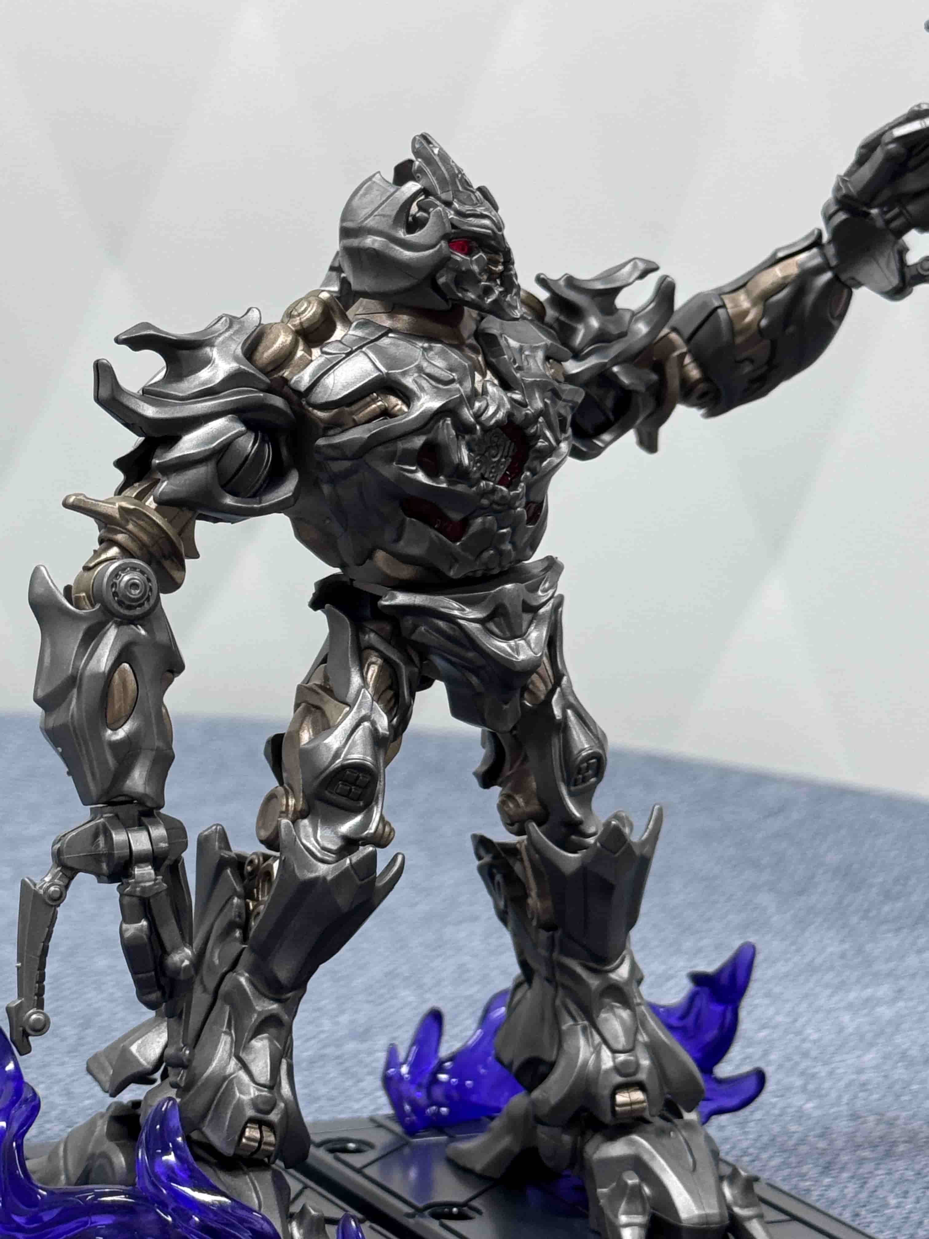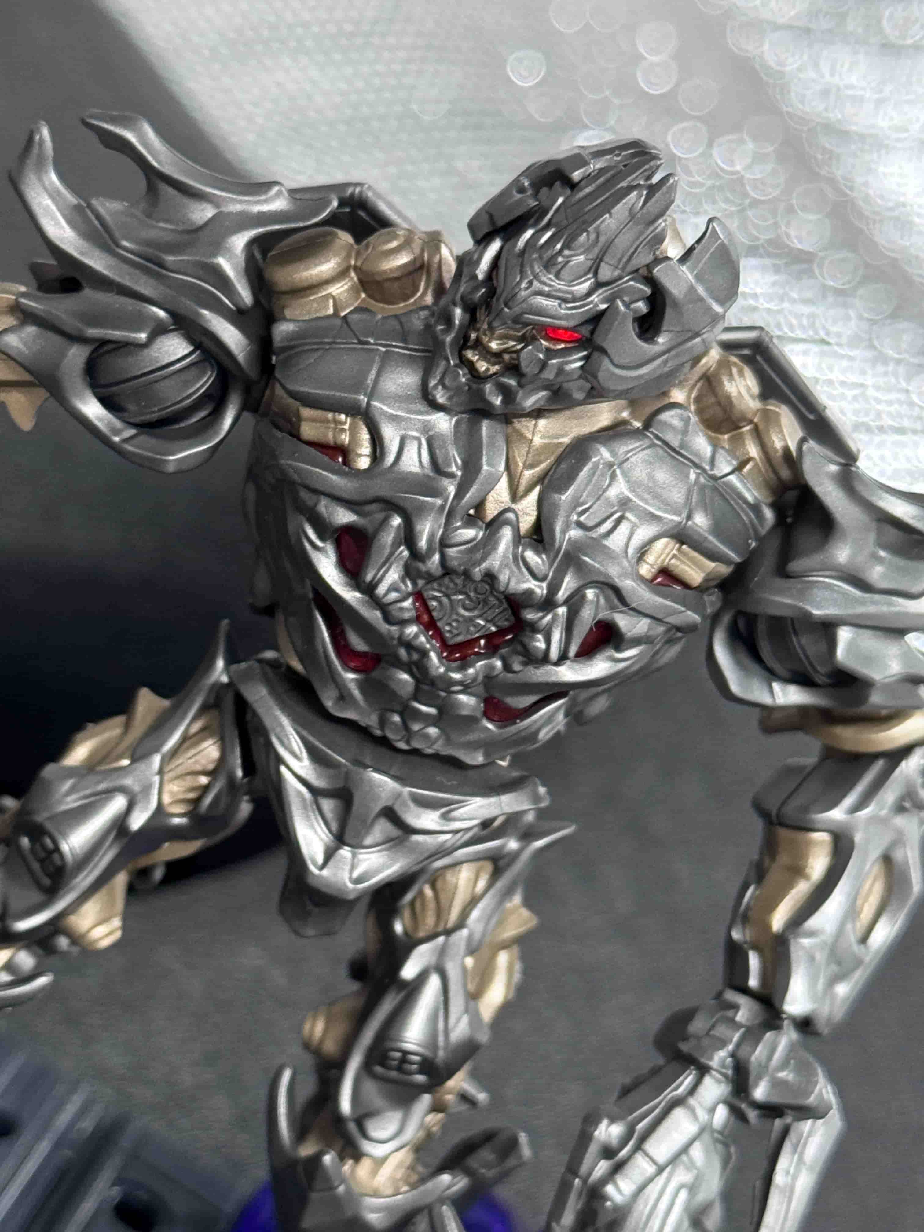 ¡Megatron se ve amenazante y poderoso! Los ojos y el pecho brillantes le dan un toque genial. El montaje fue fácil y satisfactorio. Ojalá hubiera más accesorios, pero en general, es una adición fantástica a mi colección.