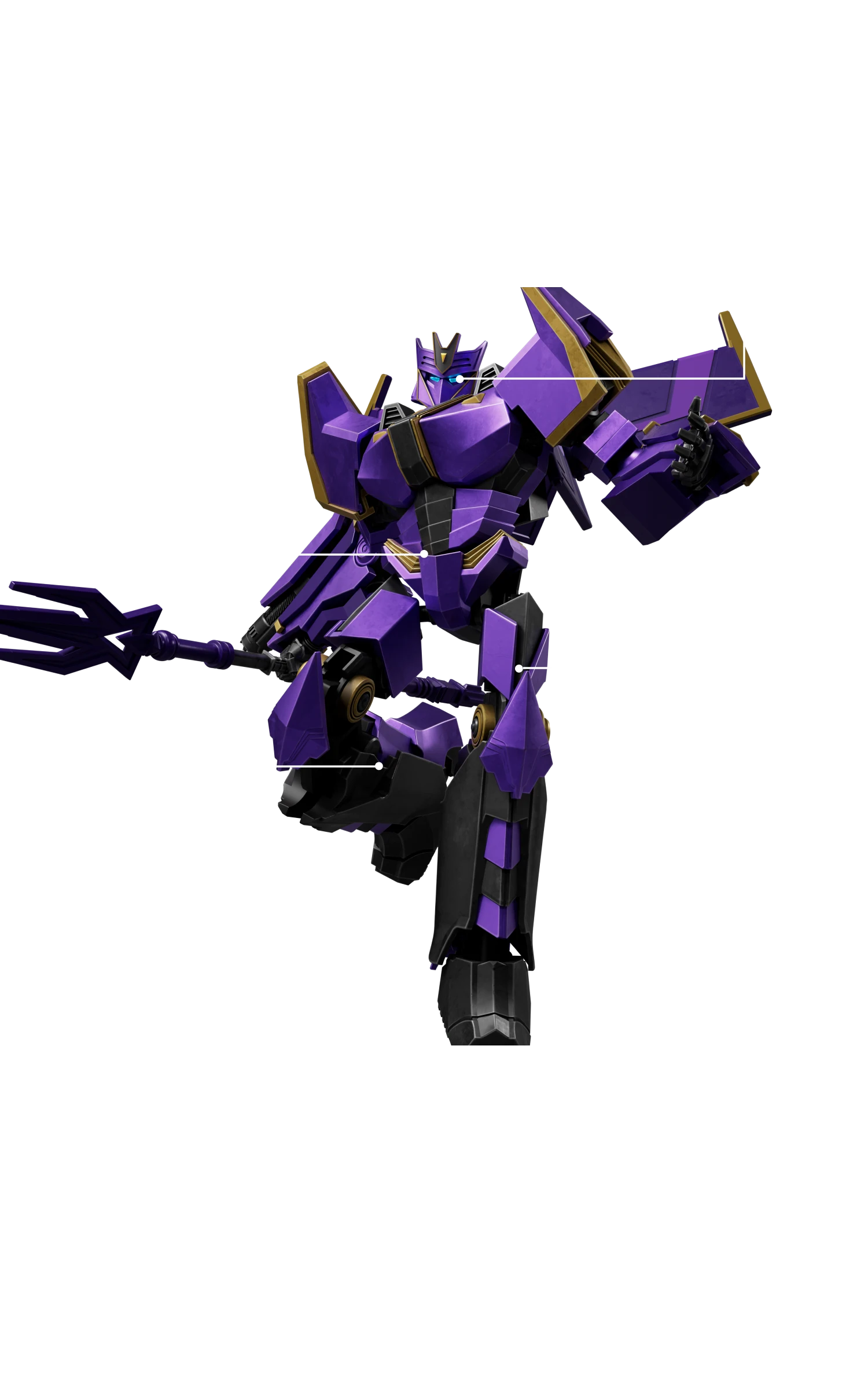 Megatronus features 20 points of articulation including enhanced knee bending, lateral shoulder movement, double-jointed elbows, and retractable hip joints.